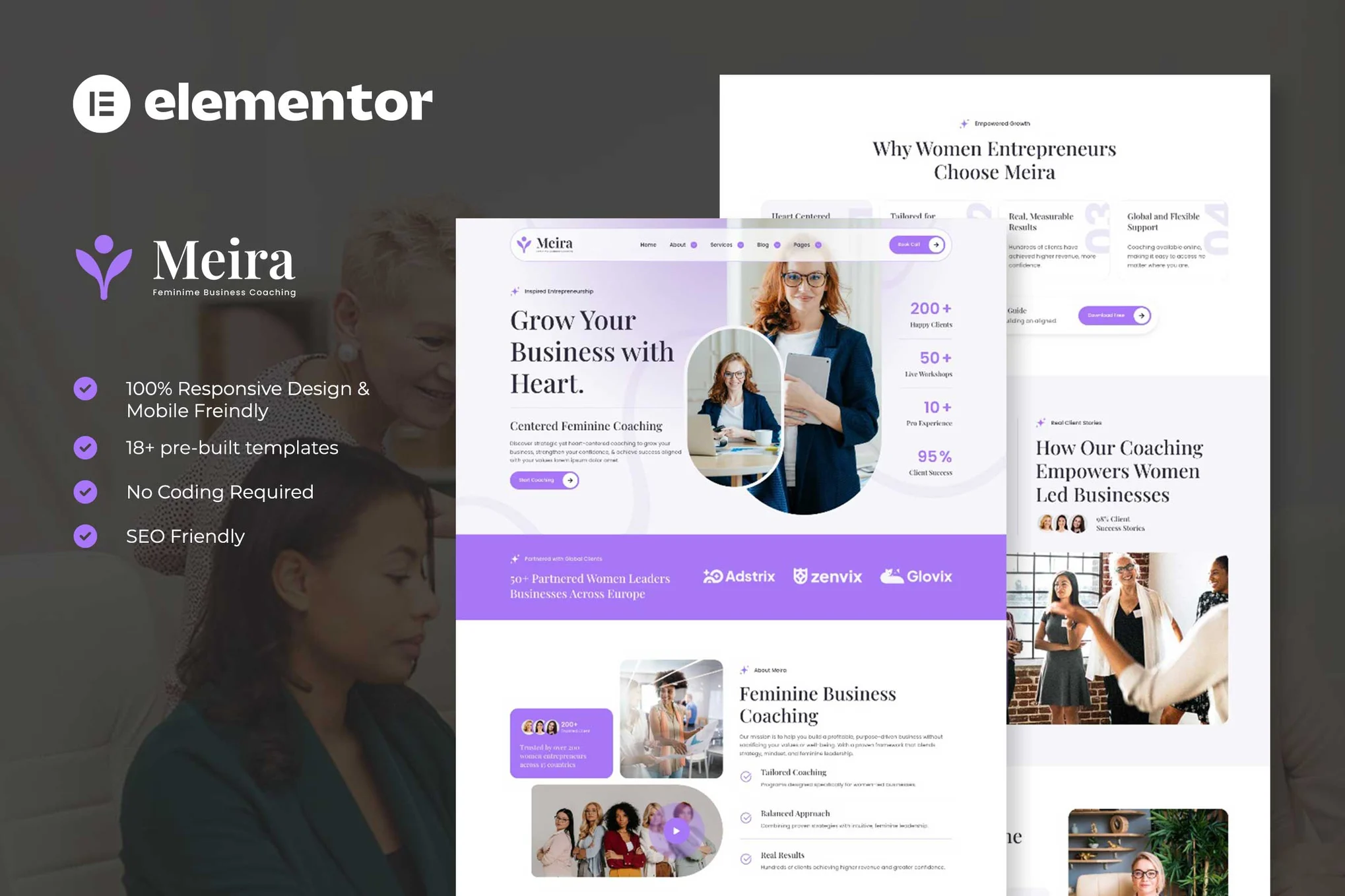 Meira is modern and elegant elementor template kits for Feminime Business Coaching. You can also use this creative template kit for any kind of business and services related to feminine coaching, business coach, life coaching, career coach, mindset coach, success coach, personal growth, women business, online coaching, coaching website and all other Meira Feminime Business Coaching websites. etc.