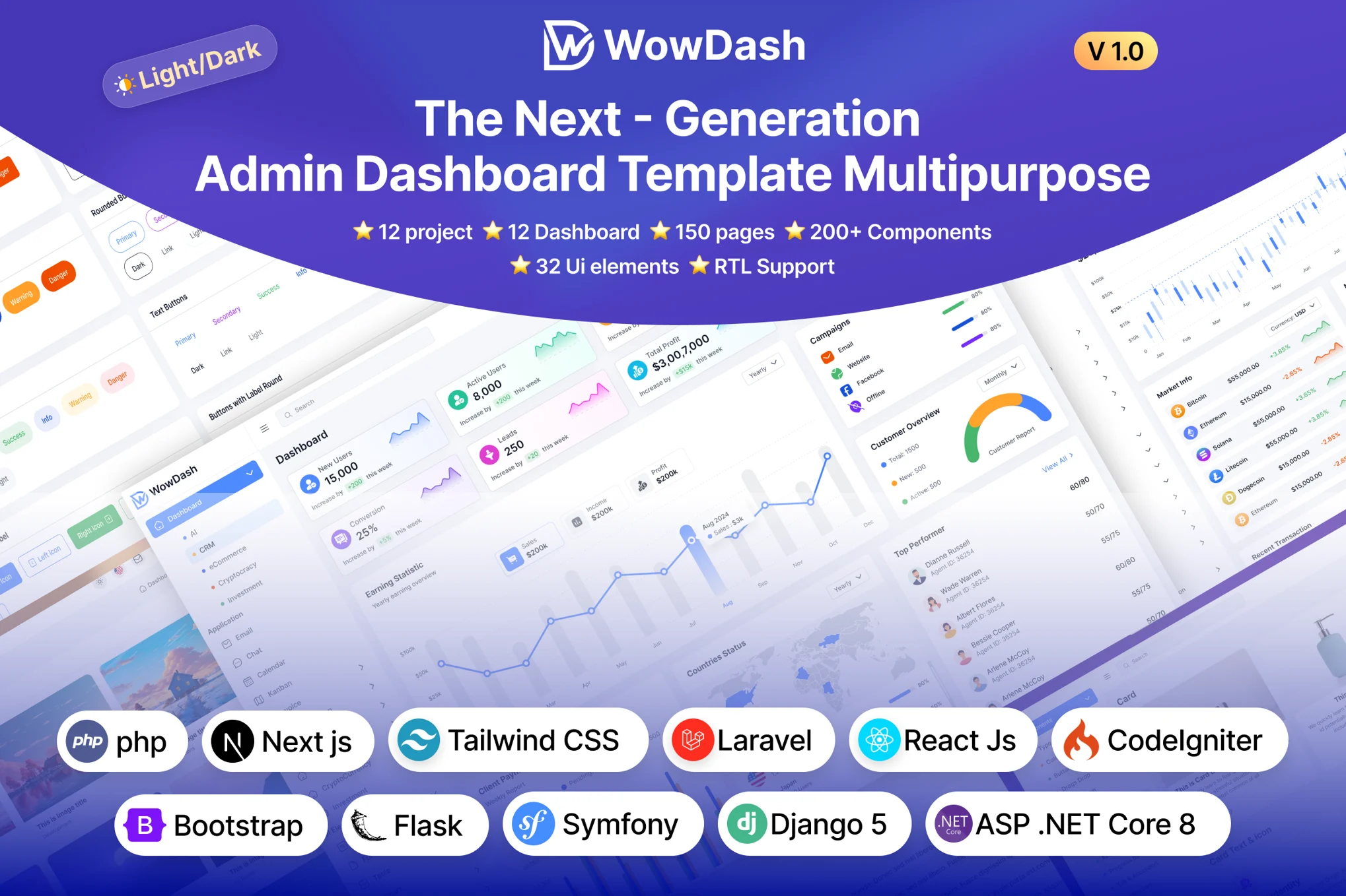 Why Choose WowDash? WowDash is crafted for: Developers who need a robust, multi-framework admin template to streamline their workflow. Startups building SaaS platforms, e-commerce stores, or data-driven dashboards. Enterprises managing complex workflows, CRM systems, and analytics platforms. Key Features Multi-Framework Support WowDash offers 12+ framework variations to suit every development preference: